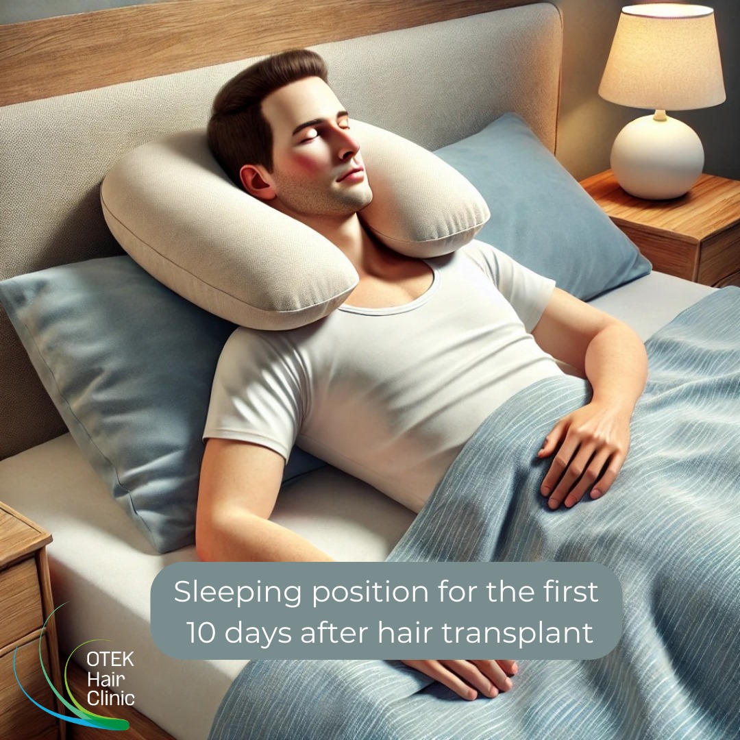 Przez pierwsze 10 dni należy spać na plecach z głową uniesioną. Świeżo przeszczepione grafty są bardzo delikatne, dlatego nie powinny dotykać poduszki. Uniesiona pozycja zmniejsza ryzyko obrzęku i chroni grafty.